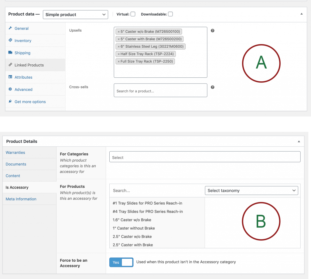 Two way linking between accessory items & product>